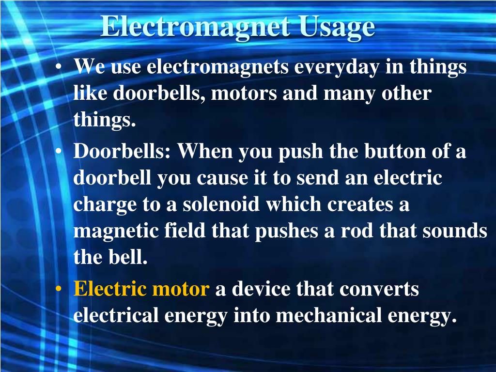 Electromagnet Usage • We use electromagnets everyday in things like doorbells, motors and many other things. • Doorbells: When you push the button of a doorbell you cause it to send an electric charge to a solenoid which creates a magnetic field that pushes a rod that sounds the bell. • Electric motor a device that converts electrical energy into mechanical energy.