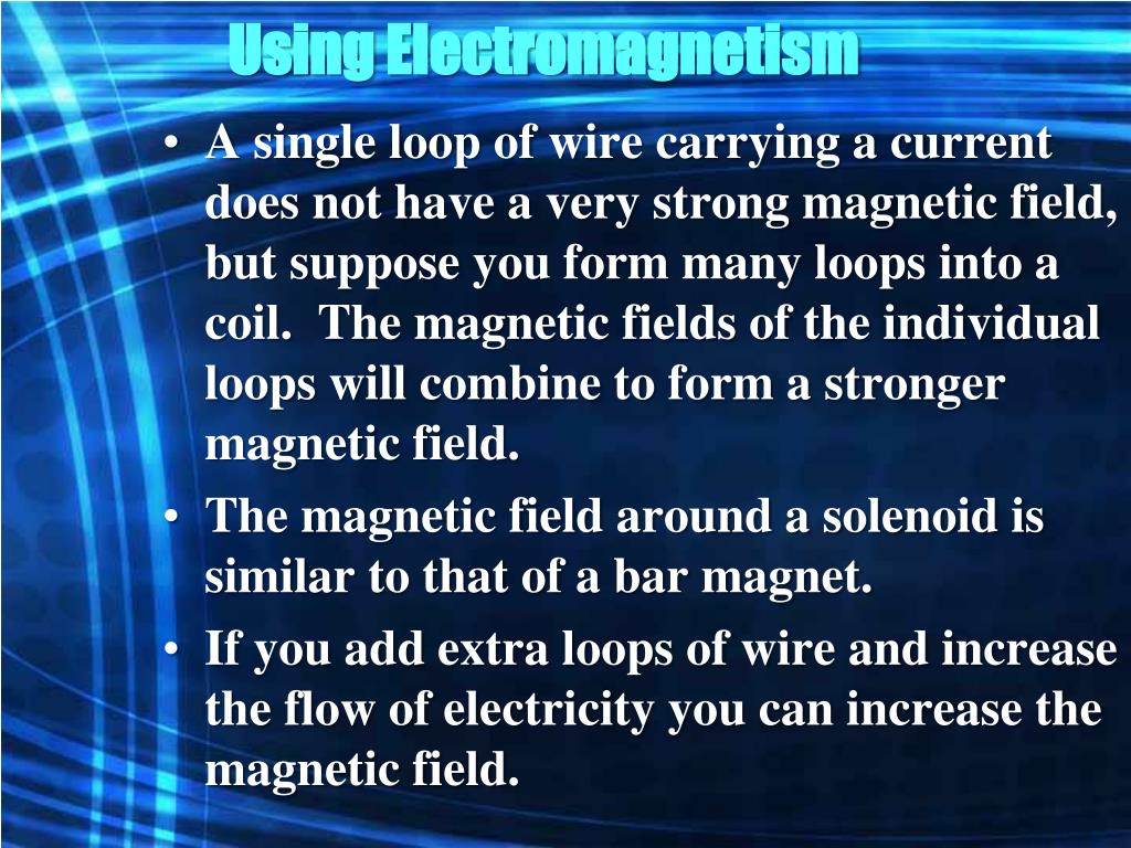 Using Electromagnetism • A single loop of wire carrying a current does not have a very strong magnetic field, but suppose you form many loops into a coil. The magnetic fields of the individual loops will combine to form a stronger magnetic field. • The magnetic field around a solenoid is similar to that of a bar magnet. • If you add extra loops of wire and increase the flow of electricity you can increase the magnetic field.
