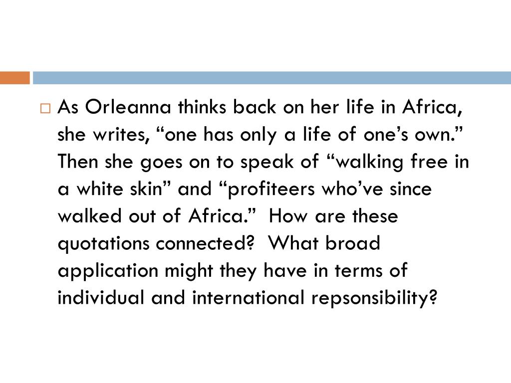 As Orleanna thinks back on her life in Africa, she writes, “one has only a life of one’s own.” Then she goes on to speak of “walking free in a white skin” and “profiteers who’ve since walked out of Africa.” How are these quotations connected? What broad application might they have in terms of individual and international repsonsibility?