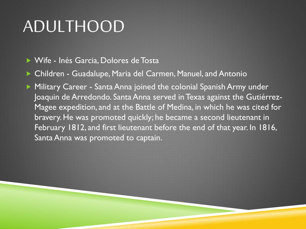 Adulthood • Wife - Inés Garcia, Dolores de Tosta • Children - Guadalupe, Maria del Carmen, Manuel, and Antonio • Military Career - Santa Anna joined the colonial Spanish Army under Joaquin de Arredondo. Santa Anna served in Texas against the Gutiérrez-Magee expedition, and at the Battle of Medina, in which he was cited for bravery. He was promoted quickly; he became a second lieutenant in February 1812, and first lieutenant before the end of that year. In 1816, Santa Anna was promoted to captain.