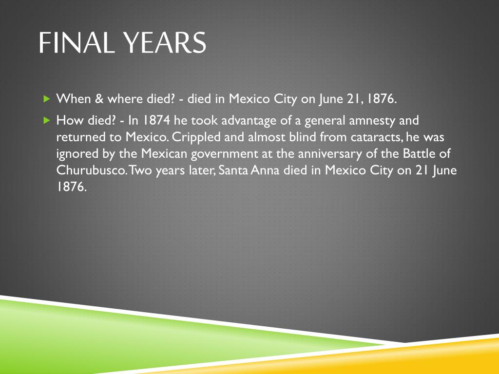 Final Years • When & where died? - died in Mexico City on June 21, 1876. • How died? - In 1874 he took advantage of a general amnesty and returned to Mexico. Crippled and almost blind from cataracts, he was ignored by the Mexican government at the anniversary of the Battle of Churubusco. Two years later, Santa Anna died in Mexico City on 21 June 1876.