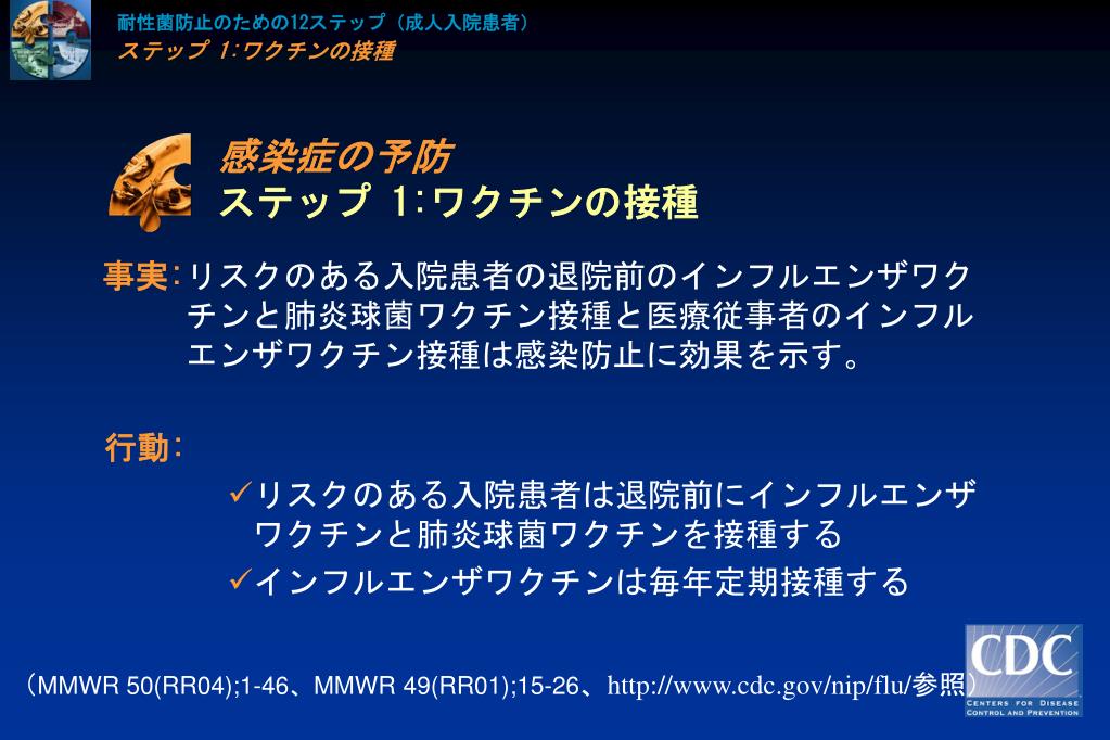 耐性菌防止のための12ステップ(成人入院患者)耐性菌防止のための12ステップ(成人入院患者) ステップ 1:ワクチンの接種 感染症の予防 ステップ 1:ワクチンの接種 行動: • リスクのある入院患者は退院前にインフルエンザワクチンと肺炎球菌ワクチンを接種する • インフルエンザワクチンは毎年定期接種する 事実:リスクのある入院患者の退院前のインフルエンザワクチンと肺炎球菌ワクチン接種と医療従事者のインフルエンザワクチン接種は感染防止に効果を示す。 (MMWR 50(RR04);1-46、MMWR 49(RR01);15-26、http://www.cdc.gov/nip/flu/参照)
