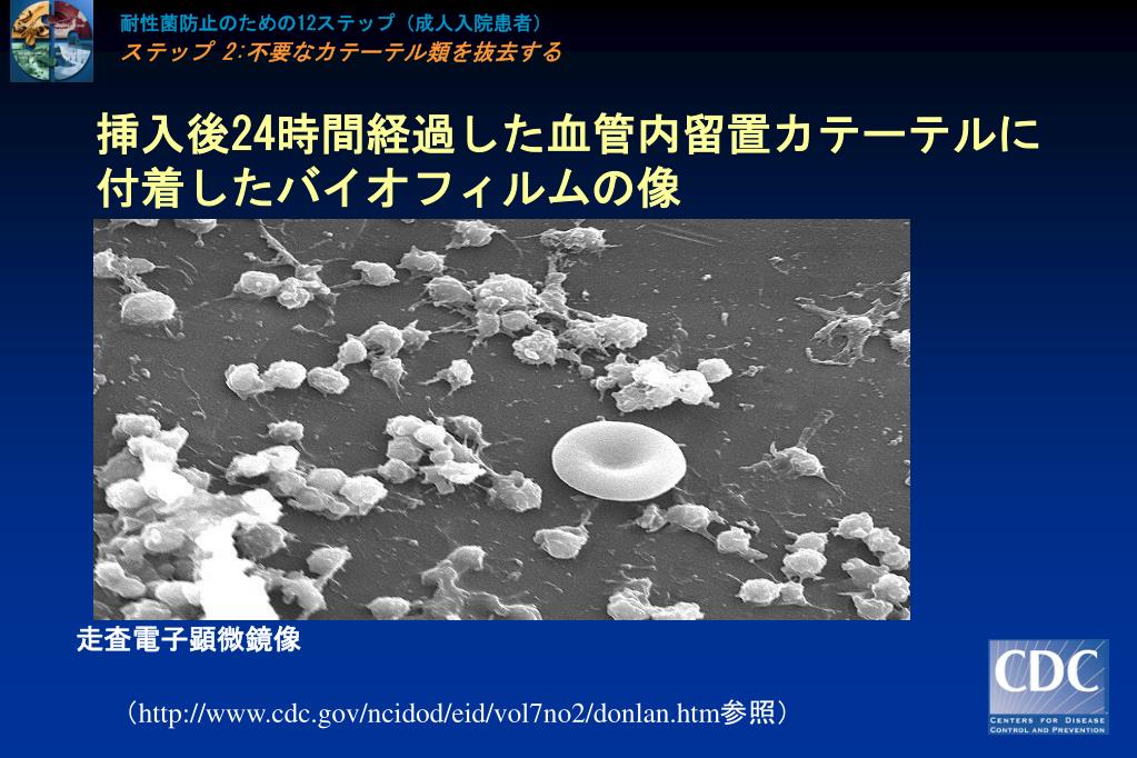 耐性菌防止のための12ステップ(成人入院患者)耐性菌防止のための12ステップ(成人入院患者) ステップ 2:不要なカテーテル類を抜去する 挿入後24時間経過した血管内留置カテーテルに付着したバイオフィルムの像 走査電子顕微鏡像 (http://www.cdc.gov/ncidod/eid/vol7no2/donlan.htm参照)