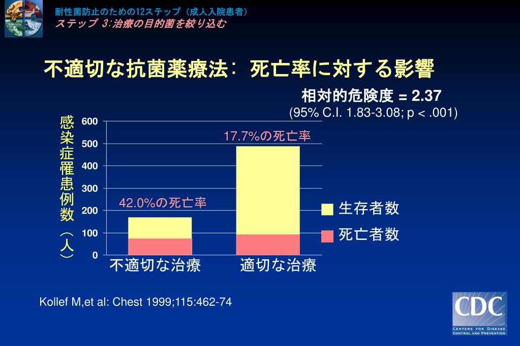 耐性菌防止のための12ステップ(成人入院患者)耐性菌防止のための12ステップ(成人入院患者) ステップ 3:治療の目的菌を絞り込む 不適切な抗菌薬療法: 死亡率に対する影響 相対的危険度 = 2.37 (95% C.I. 1.83-3.08; p < .001) 感染症罹患例数(人) 17.7%の死亡率 42.0%の死亡率 生存者数 死亡者数 不適切な治療適切な治療 Kollef M,et al: Chest 1999;115:462-74