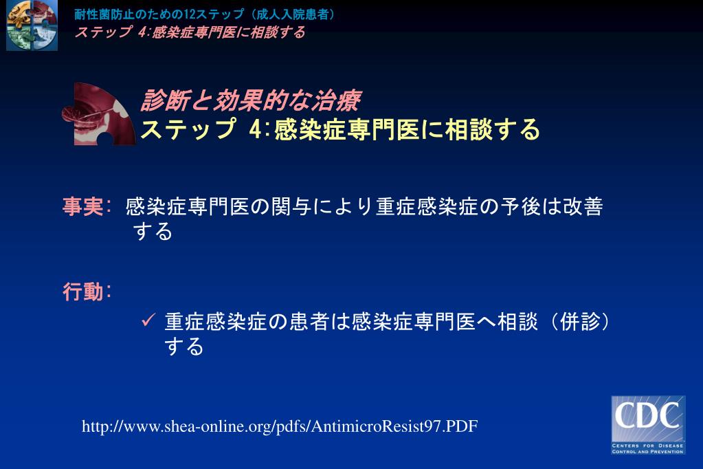 耐性菌防止のための12ステップ(成人入院患者)耐性菌防止のための12ステップ(成人入院患者) ステップ 4:感染症専門医に相談する 診断と効果的な治療 ステップ 4:感染症専門医に相談する 事実:感染症専門医の関与により重症感染症の予後は改善する 行動: • 重症感染症の患者は感染症専門医へ相談(併診)する http://www.shea-online.org/pdfs/AntimicroResist97.PDF