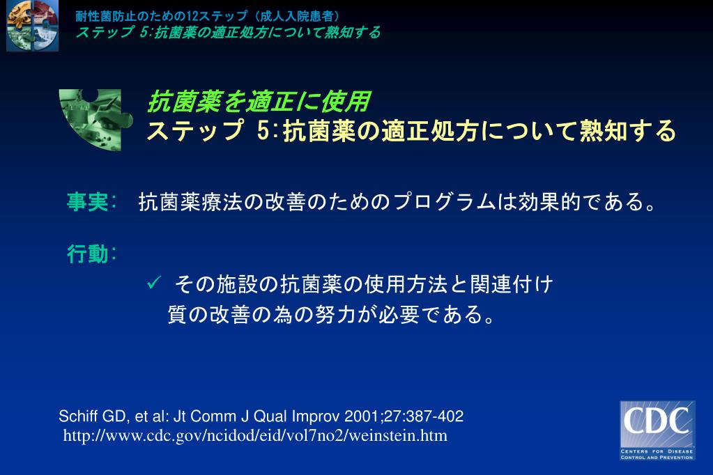 耐性菌防止のための12ステップ(成人入院患者)耐性菌防止のための12ステップ(成人入院患者) ステップ 5:抗菌薬の適正処方について熟知する 抗菌薬を適正に使用ステップ 5:抗菌薬の適正処方について熟知する 事実:抗菌薬療法の改善のためのプログラムは効果的である。 行動: • その施設の抗菌薬の使用方法と関連付け 質の改善の為の努力が必要である。 Schiff GD, et al: Jt Comm J Qual Improv 2001;27:387-402 http://www.cdc.gov/ncidod/eid/vol7no2/weinstein.htm