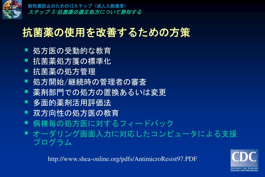 耐性菌防止のための12ステップ(成人入院患者)耐性菌防止のための12ステップ(成人入院患者) ステップ 5:抗菌薬の適正処方について熟知する 抗菌薬の使用を改善するための方策 • 処方医の受動的な教育 • 抗菌薬処方箋の標準化 • 抗菌薬の処方管理 • 処方開始/継続時の管理者の審査 • 薬剤部門での処方の置換あるいは変更 • 多面的薬剤活用評価法 • 双方向性の処方医の教育 • 病棟毎の処方医に対するフィードバック • オーダリング画面入力に対応したコンピュータによる支援プログラム http://www.shea-online.org/pdfs/AntimicroResist97.PDF