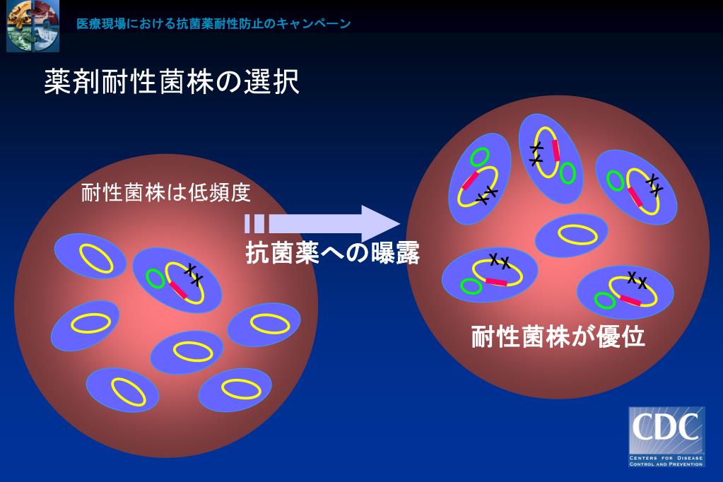 医療現場における抗菌薬耐性防止のキャンペーン医療現場における抗菌薬耐性防止のキャンペーン 耐性菌株は低頻度 抗菌薬への曝露 耐性菌株が優位 x x x x x x x x x x x x 薬剤耐性菌株の選択
