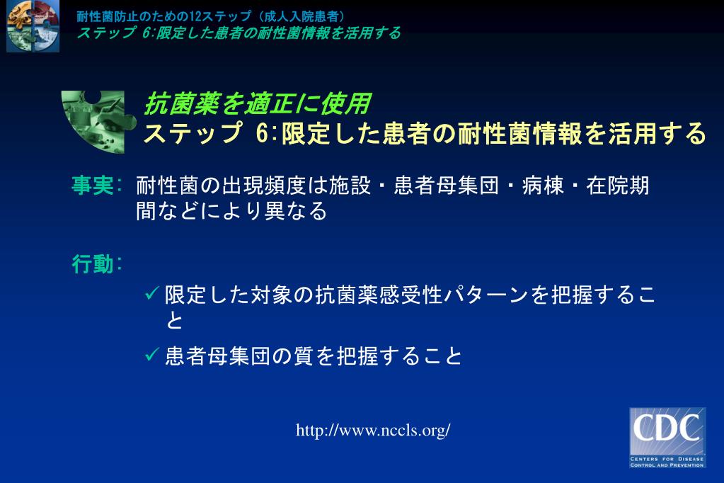耐性菌防止のための12ステップ(成人入院患者)耐性菌防止のための12ステップ(成人入院患者) ステップ 6:限定した患者の耐性菌情報を活用する 抗菌薬を適正に使用ステップ 6:限定した患者の耐性菌情報を活用する 事実:耐性菌の出現頻度は施設・患者母集団・病棟・在院期間などにより異なる 行動: • 限定した対象の抗菌薬感受性パターンを把握すること • 患者母集団の質を把握すること http://www.nccls.org/