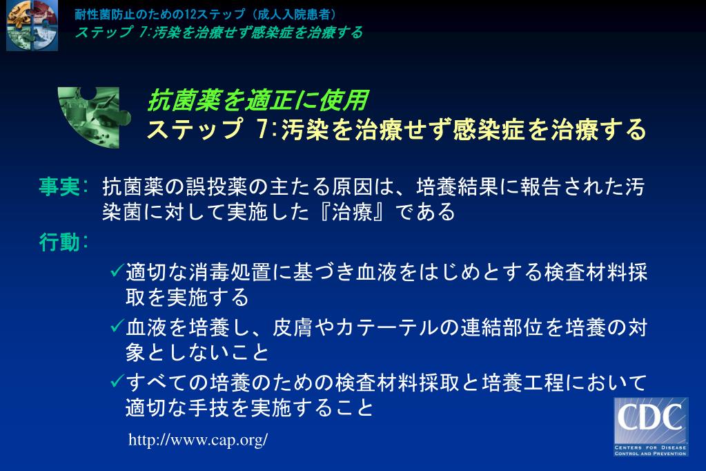 耐性菌防止のための12ステップ(成人入院患者)耐性菌防止のための12ステップ(成人入院患者) ステップ 7:汚染を治療せず感染症を治療する 抗菌薬を適正に使用ステップ 7:汚染を治療せず感染症を治療する 事実:抗菌薬の誤投薬の主たる原因は、培養結果に報告された汚染菌に対して実施した『治療』である 行動: • 適切な消毒処置に基づき血液をはじめとする検査材料採取を実施する • 血液を培養し、皮膚やカテーテルの連結部位を培養の対象としないこと • すべての培養のための検査材料採取と培養工程において適切な手技を実施すること http://www.cap.org/
