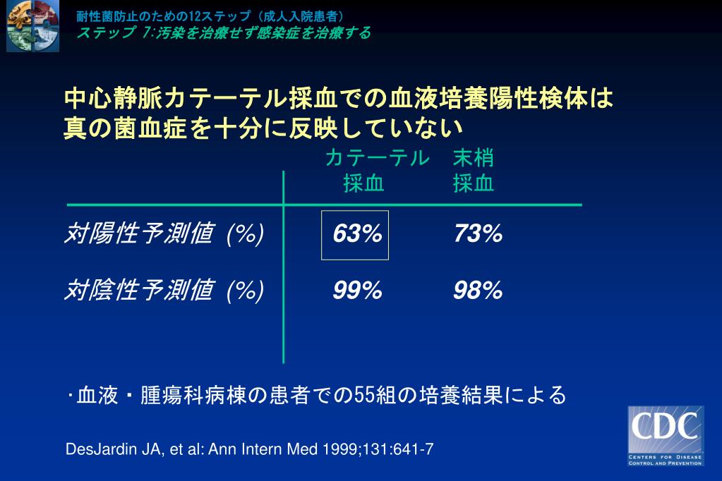耐性菌防止のための12ステップ(成人入院患者)耐性菌防止のための12ステップ(成人入院患者) ステップ 7:汚染を治療せず感染症を治療する 中心静脈カテーテル採血での血液培養陽性検体は真の菌血症を十分に反映していない カテーテル末梢 採血採血 対陽性予測値 (%)63%73% 対陰性予測値 (%)99%98% • 血液・腫瘍科病棟の患者での55組の培養結果による DesJardin JA, et al: Ann Intern Med 1999;131:641-7