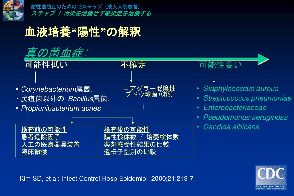 耐性菌防止のための12ステップ(成人入院患者)耐性菌防止のための12ステップ(成人入院患者) ステップ 7:汚染を治療せず感染症を治療する 検査前の可能性 • 患者危険因子 • 人工の医療器具装着 • 臨床徴候 • 検査後の可能性 • 陽性検体数 / 培養検体数 • 薬剤感受性結果の比較 • 遺伝子型別の比較 Kim SD, et al: Infect Control Hosp Epidemiol 2000;21:213-7 血液培養“陽性”の解釈 真の菌血症: 可能性低い不確定可能性高い • Staphylococcus aureus • Streptococcus pneumoniae • Enterobacteriaceae • Pseudomonas aeruginosa • Candida albicans • Corynebacterium属菌. • 炭疽菌以外のBacillus属菌. • Propionibacterium acnes コアグラーゼ陰性 ブドウ球菌(CNS)