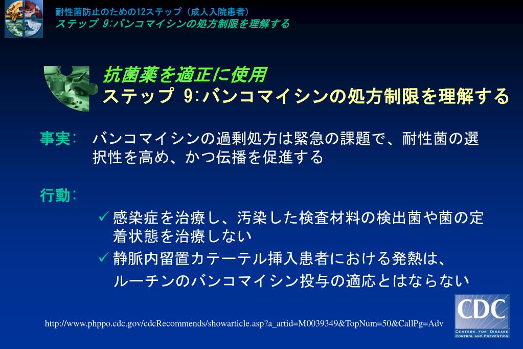 耐性菌防止のための12ステップ(成人入院患者)耐性菌防止のための12ステップ(成人入院患者) ステップ 9:バンコマイシンの処方制限を理解する 抗菌薬を適正に使用ステップ 9:バンコマイシンの処方制限を理解する 事実:バンコマイシンの過剰処方は緊急の課題で、耐性菌の選択性を高め、かつ伝播を促進する 行動: • 感染症を治療し、汚染した検査材料の検出菌や菌の定着状態を治療しない • 静脈内留置カテーテル挿入患者における発熱は、 ルーチンのバンコマイシン投与の適応とはならない http://www.phppo.cdc.gov/cdcRecommends/showarticle.asp?a_artid=M0039349&TopNum=50&CallPg=Adv