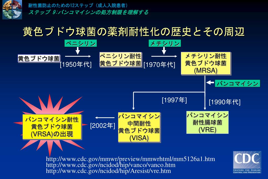 耐性菌防止のための12ステップ(成人入院患者)耐性菌防止のための12ステップ(成人入院患者) ステップ 9:バンコマイシンの処方制限を理解する 黄色ブドウ球菌の薬剤耐性化の歴史とその周辺 ペニシリン メチシリン メチシリン耐性 黄色ブドウ球菌 (MRSA) ペニシリン耐性 黄色ブドウ球菌 黄色ブドウ球菌 [1950年代] [1970年代] バンコマイシン [1997年] [1990年代] バンコマイシン 耐性腸球菌 (VRE) バンコマイシン 中間耐性 黄色ブドウ球菌 (VISA) バンコマイシン耐性 黄色ブドウ球菌 (VRSA)の出現 [2002年] http://www.cdc.gov/mmwr/preview/mmwrhtml/mm5126a1.htm http://www.cdc.gov/ncidod/hip/vanco/vanco.htm http://www.cdc.gov/ncidod/hip/Aresist/vre.htm