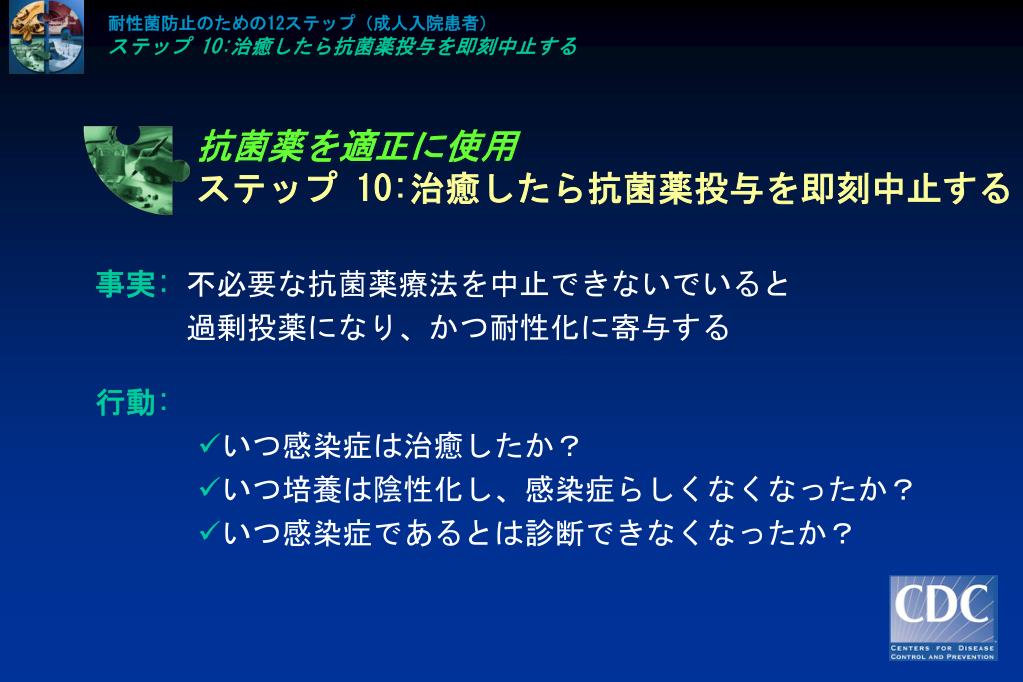 耐性菌防止のための12ステップ(成人入院患者)耐性菌防止のための12ステップ(成人入院患者) ステップ 10:治癒したら抗菌薬投与を即刻中止する 抗菌薬を適正に使用ステップ 10:治癒したら抗菌薬投与を即刻中止する 事実:不必要な抗菌薬療法を中止できないでいると 過剰投薬になり、かつ耐性化に寄与する 行動: • いつ感染症は治癒したか? • いつ培養は陰性化し、感染症らしくなくなったか? • いつ感染症であるとは診断できなくなったか?
