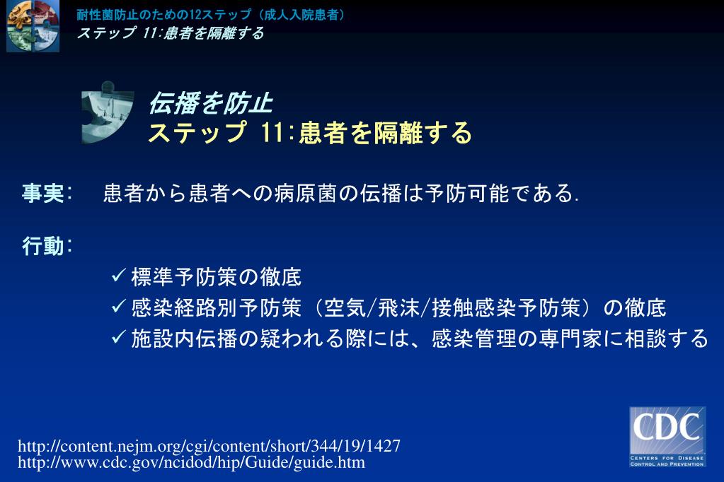 耐性菌防止のための12ステップ(成人入院患者)耐性菌防止のための12ステップ(成人入院患者) ステップ 11:患者を隔離する 伝播を防止ステップ 11:患者を隔離する 事実:患者から患者への病原菌の伝播は予防可能である. 行動: • 標準予防策の徹底 • 感染経路別予防策(空気/飛沫/接触感染予防策)の徹底 • 施設内伝播の疑われる際には、感染管理の専門家に相談する http://content.nejm.org/cgi/content/short/344/19/1427 http://www.cdc.gov/ncidod/hip/Guide/guide.htm