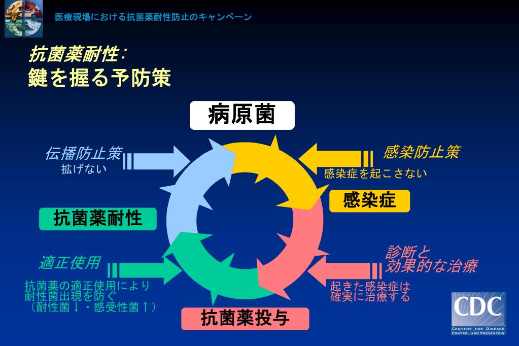 医療現場における抗菌薬耐性防止のキャンペーン医療現場における抗菌薬耐性防止のキャンペーン 感染防止策 伝播防止策 拡げない 感染症を起こさない 診断と 効果的な治療 適正使用 抗菌薬の適正使用により 耐性菌出現を防ぐ (耐性菌↓・感受性菌↑) 起きた感染症は 確実に治療する 抗菌薬耐性:鍵を握る予防策 病原菌 耐性菌 病原菌 感染症 抗菌薬耐性 抗菌薬投与