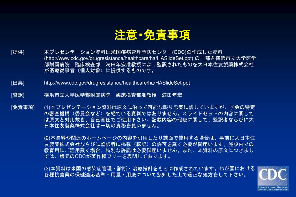 注意・免責事項 [提供] 本プレゼンテーション資料は米国疾病管理予防センター(CDC)の作成した資料(http://www.cdc.gov/drugresistance/healthcare/ha/HASlideSet.ppt) の一部を横浜市立大学医学部附属病院 臨床検査部 満田年宏准教授により監訳されたものを大日本住友製薬株式会社が医療従事者(個人対象)に提供するものです。 [出典] http://www.cdc.gov/drugresistance/healthcare/ha/HASlideSet.ppt [監訳] 横浜市立大学医学部附属病院 臨床検査部准教授 満田年宏 [免責事項] (1)本プレゼンテーション資料は原文に沿って可能な限り忠実に訳していますが、学会の特定の審査機構(委員会など)を経ている資料ではありません。スライドセットの内容に関しては原文と対比戴き、自己責任でご使用下さい。記載内容の瑕疵に関して、監訳者ならびに大日本住友製薬株式会社は一切の責務を負いません。 (2)本資料や関連のホームページの内容を引用したり誌面で使用する場合は、事前に大日本住友製薬株式会社ならびに監訳者に掲載(転記)の許可を戴く必要が御座います。施設内での教育用にご活用戴く場合、特別な許諾は必要御座いません。また、本資料の原文につきましては、版元のCDCが著作権フリーを表明しております。 (3)本資料は米国の感染症管理・診断・治療指針をもとに作成されています。わが国における各種抗菌薬の保健適応基準・用量・用法について熟知した上で適正な処方をして下さい。