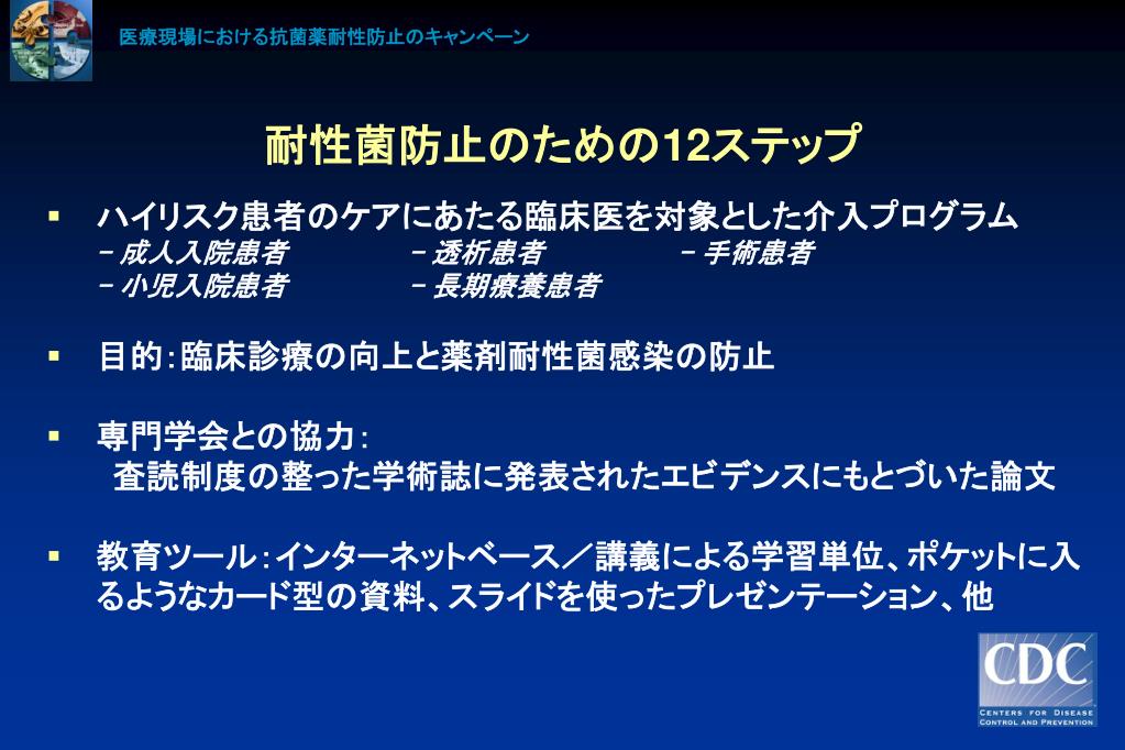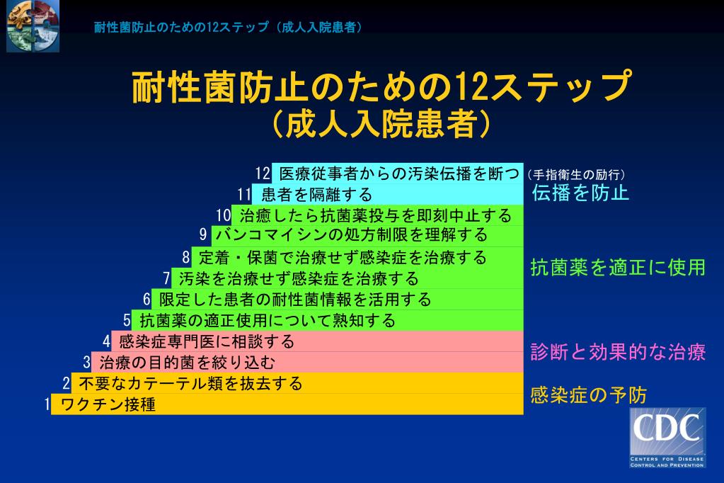 耐性菌防止のための 12 ステップ (成人入院患者). 米国 疾病管理予防センター (CDC) : 薬剤耐性菌防止キャンペーン Campaign to Prevent Antimicrobial Resistance. Centers for Disease Control and Prevention National Center for Infectious Diseases Division of Healthcare Quality Promotion. http://www.cdc.gov/drugresistance/healthcare
