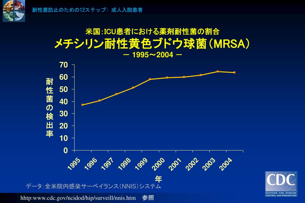 耐性菌防止のための12ステップ: 成人入院患者 米国:ICU患者における薬剤耐性菌の割合メチシリン耐性黄色ブドウ球菌(MRSA)- 1995~2004 - データ:全米院内感染サーベイランス(NNIS)システム hhtp:www.cdc.gov/ncidod/hip/surveill/nnis.htm 参照