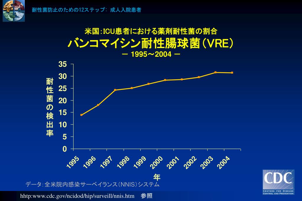 耐性菌防止のための12ステップ: 成人入院患者 米国:ICU患者における薬剤耐性菌の割合バンコマイシン耐性腸球菌(VRE)- 1995~2004 - データ:全米院内感染サーベイランス(NNIS)システム hhtp:www.cdc.gov/ncidod/hip/surveill/nnis.htm 参照