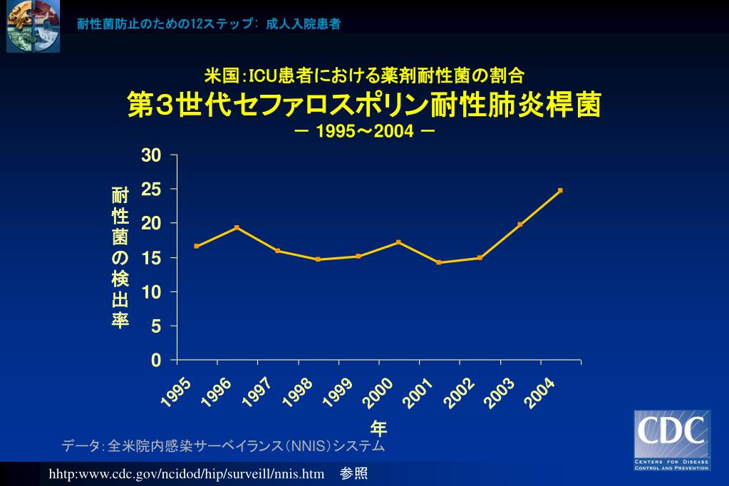 耐性菌防止のための12ステップ: 成人入院患者 米国:ICU患者における薬剤耐性菌の割合第3世代セファロスポリン耐性肺炎桿菌- 1995~2004 - データ:全米院内感染サーベイランス(NNIS)システム hhtp:www.cdc.gov/ncidod/hip/surveill/nnis.htm 参照