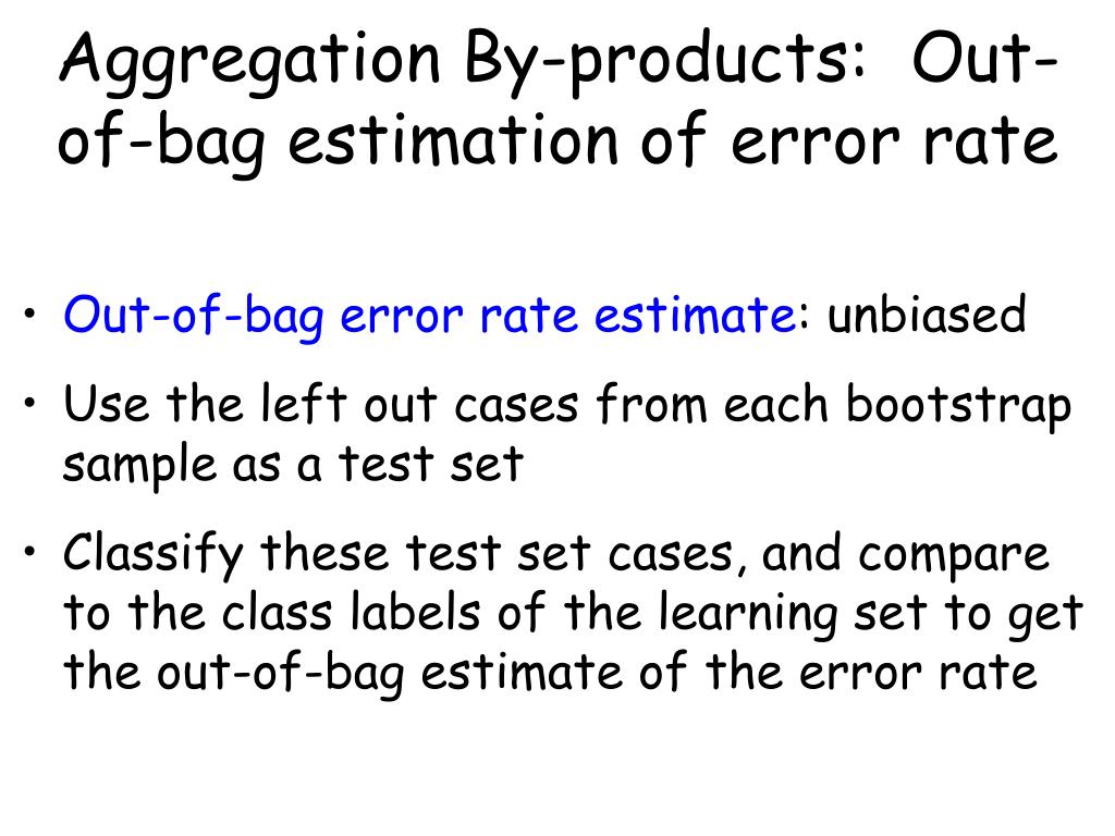 Aggregation By-products: Out-of-bag estimation of error rate • Out-of-bag error rate estimate: unbiased • Use the left out cases from each bootstrap sample as a test set • Classify these test set cases, and compare to the class labels of the learning set to get the out-of-bag estimate of the error rate