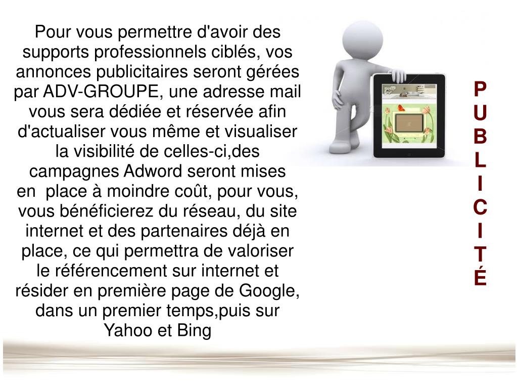 Pour vous permettre d'avoir des supports professionnels ciblés, vos annonces publicitaires seront gérées par ADV-GROUPE, une adresse mail vous sera dédiée et réservée afin d'actualiser vous même et visualiser la visibilité de celles-ci,des campagnes Adword seront mises en place à moindre coût, pour vous, vous bénéficierez du réseau, du site internet et des partenaires déjà en place, ce qui permettra de valoriser le référencement sur internet et résider en première page de Google, dans un premier temps,puis sur Yahoo et Bing P U B L I C I T É