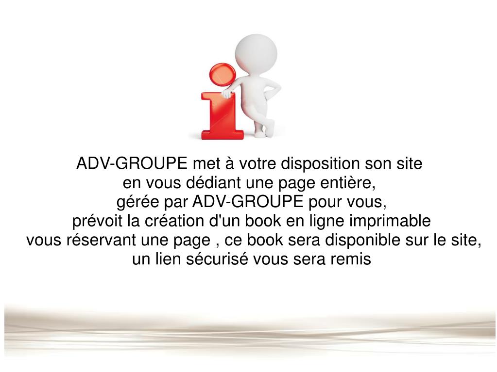ADV-GROUPE met à votre disposition son site en vous dédiant une page entière, gérée par ADV-GROUPE pour vous, prévoit la création d'un book en ligne imprimable vous réservant une page , ce book sera disponible sur le site, un lien sécurisé vous sera remis