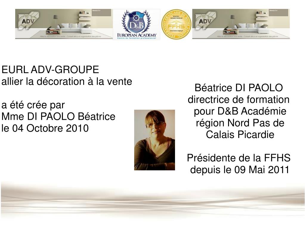 EURL ADV-GROUPE allier la décoration à la vente a été crée par Mme DI PAOLO Béatrice le 04 Octobre 2010 Béatrice DI PAOLO directrice de formation pour D&B Académie région Nord Pas de Calais Picardie Présidente de la FFHS depuis le 09 Mai 2011