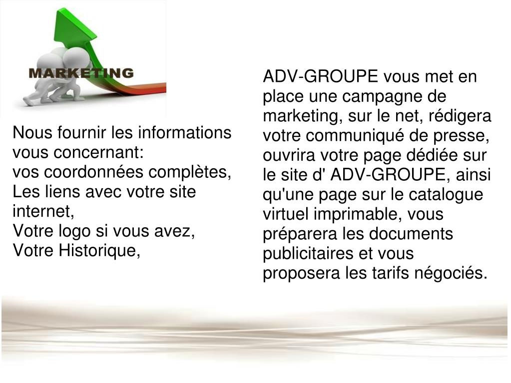 Nous fournir les informations vous concernant: vos coordonnées complètes, Les liens avec votre site internet, Votre logo si vous avez, Votre Historique, ADV-GROUPE vous met en place une campagne de marketing, sur le net, rédigera votre communiqué de presse, ouvrira votre page dédiée sur le site d' ADV-GROUPE, ainsi qu'une page sur le catalogue virtuel imprimable, vous préparera les documents publicitaires et vous proposera les tarifs négociés.
