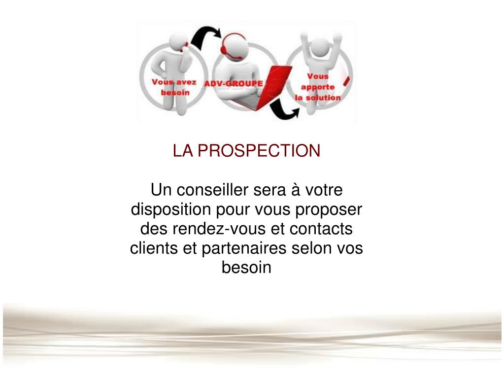 LA PROSPECTION Un conseiller sera à votre disposition pour vous proposer des rendez-vous et contacts clients et partenaires selon vos besoin