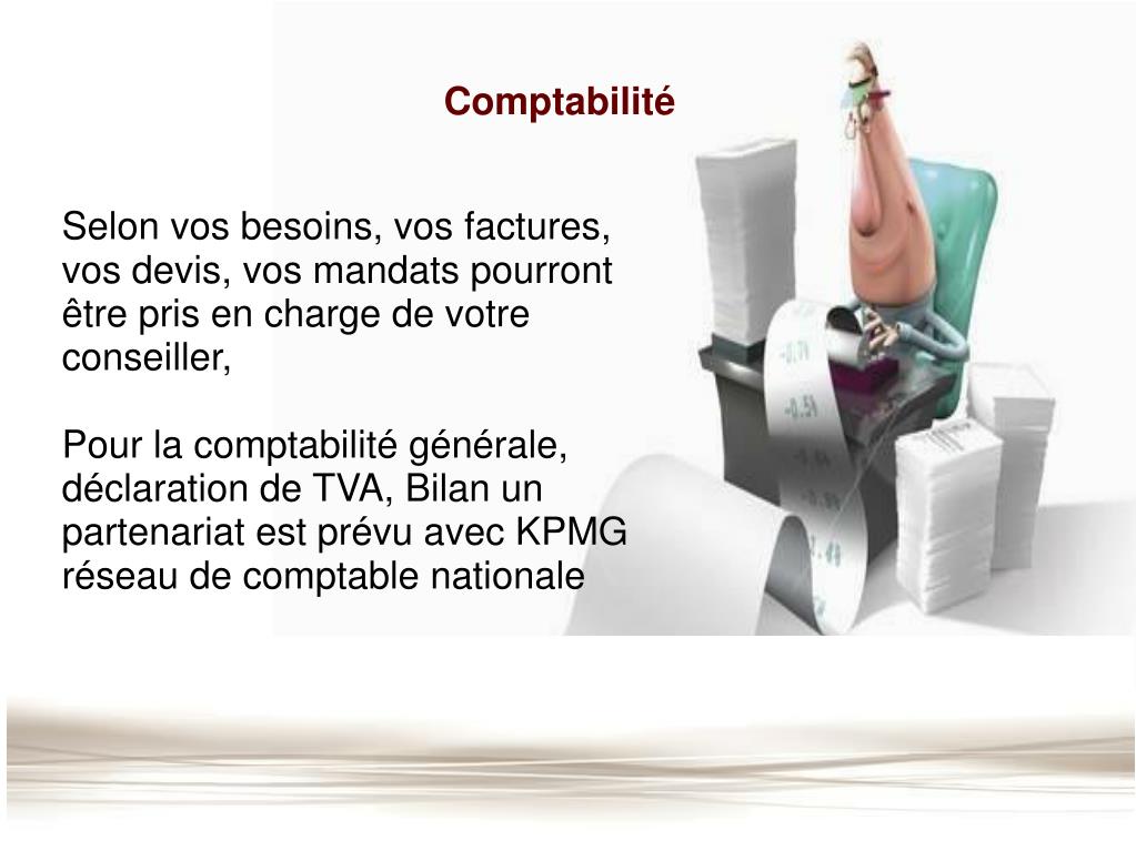 Comptabilité Selon vos besoins, vos factures, vos devis, vos mandats pourront être pris en charge de votre conseiller, Pour la comptabilité générale, déclaration de TVA, Bilan un partenariat est prévu avec KPMG réseau de comptable nationale