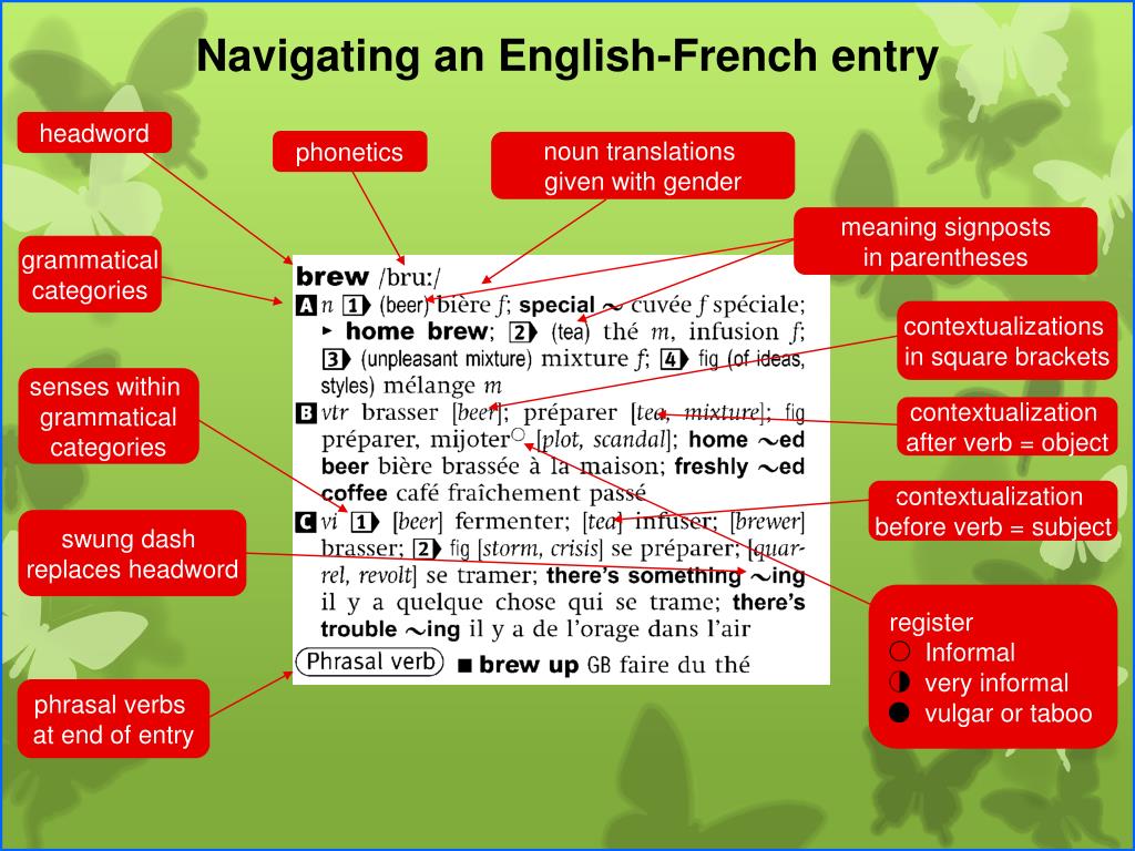 La bonne utilisation du dico!. (How to use the dictionary efficiently). register Informal very informal vulgar or taboo. Navigating an English-French entry. headword. phonetics. noun translations given with gender. meaning signposts in parentheses. grammatical categories.