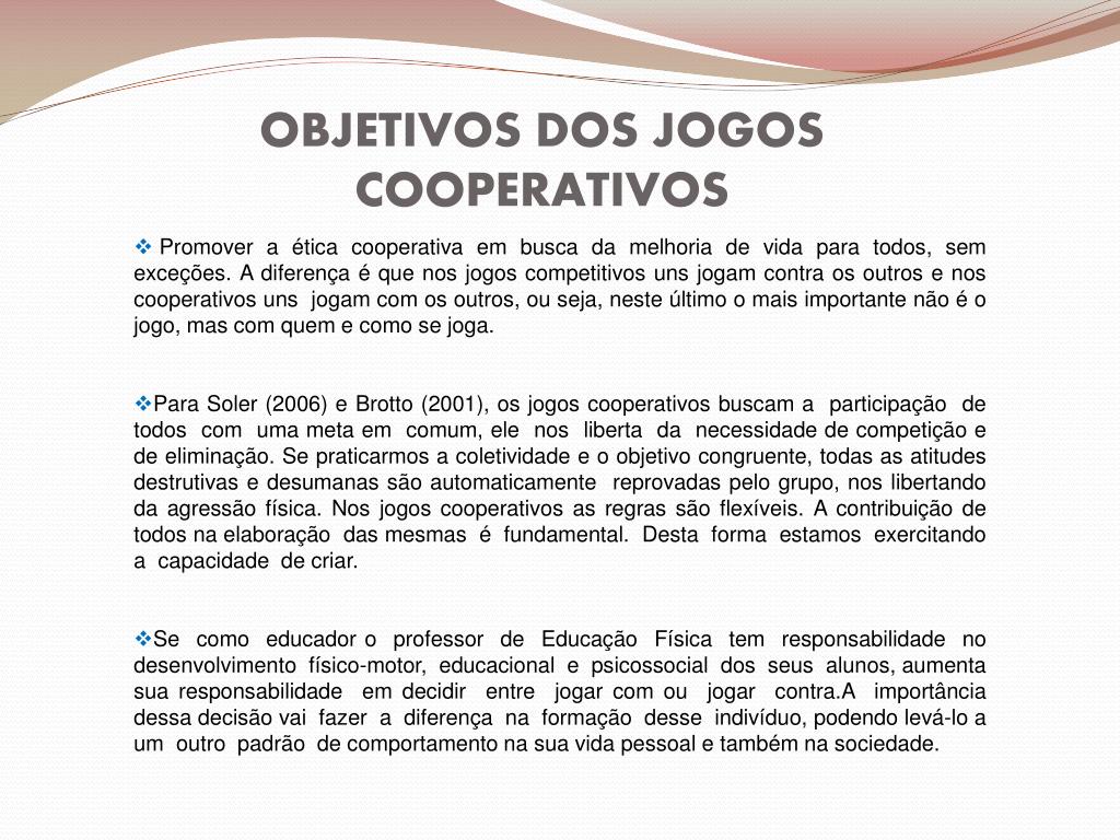 JOGOS COOPERATIVOS O que são Jogos Cooperativos? Jogos cooperativos são dinâmicas de grupo que têm por objetivo, em primeiro lugar, despertar a consciência de cooperação, isto é, mostrar que a cooperação é uma alternativa possível e saudável no campo das relações sociais; em segundo lugar, promover efetivamente a cooperação entre as pessoas, na exata medida em que os jogos são, eles próprios, experiências cooperativas (BARRETO apud SOLER, 2006, p. 21).