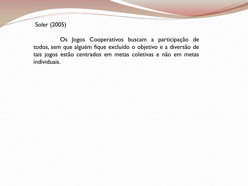 Soler (2005) Os Jogos Cooperativos buscam a participação de todos, sem que alguém fique excluído o objetivo e a diversão de tais jogos estão centrados em metas coletivas e não em metas individuais.