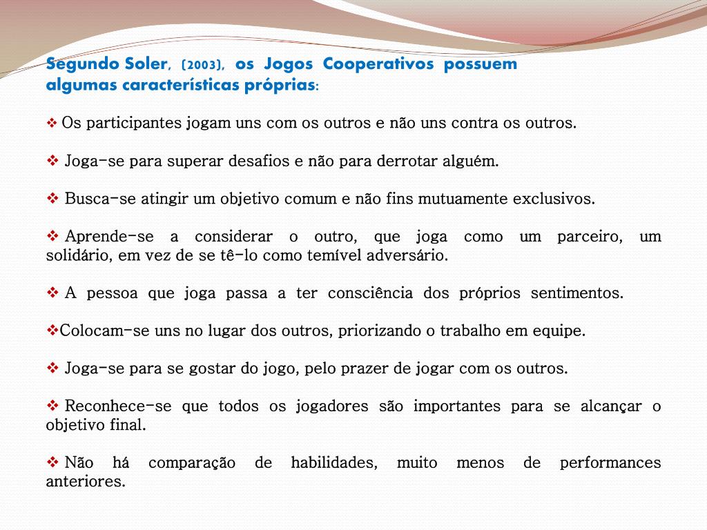 Segundo Soler, (2003), os Jogos Cooperativos possuem • algumas características próprias: • Os participantes jogam uns com os outros e não uns contra os outros. • Joga-se para superar desafios e não para derrotar alguém. • Busca-se atingir um objetivo comum e não fins mutuamente exclusivos. • Aprende-se a considerar o outro, que joga como um parceiro, um solidário, em vez de se tê-lo como temível adversário. • A pessoa que joga passa a ter consciência dos próprios sentimentos. • Colocam-se uns no lugar dos outros, priorizando o trabalho em equipe. • Joga-se para se gostar do jogo, pelo prazer de jogar com os outros. • Reconhece-se que todos os jogadores são importantes para se alcançar o objetivo final. • Não há comparação de habilidades, muito menos de performances anteriores.