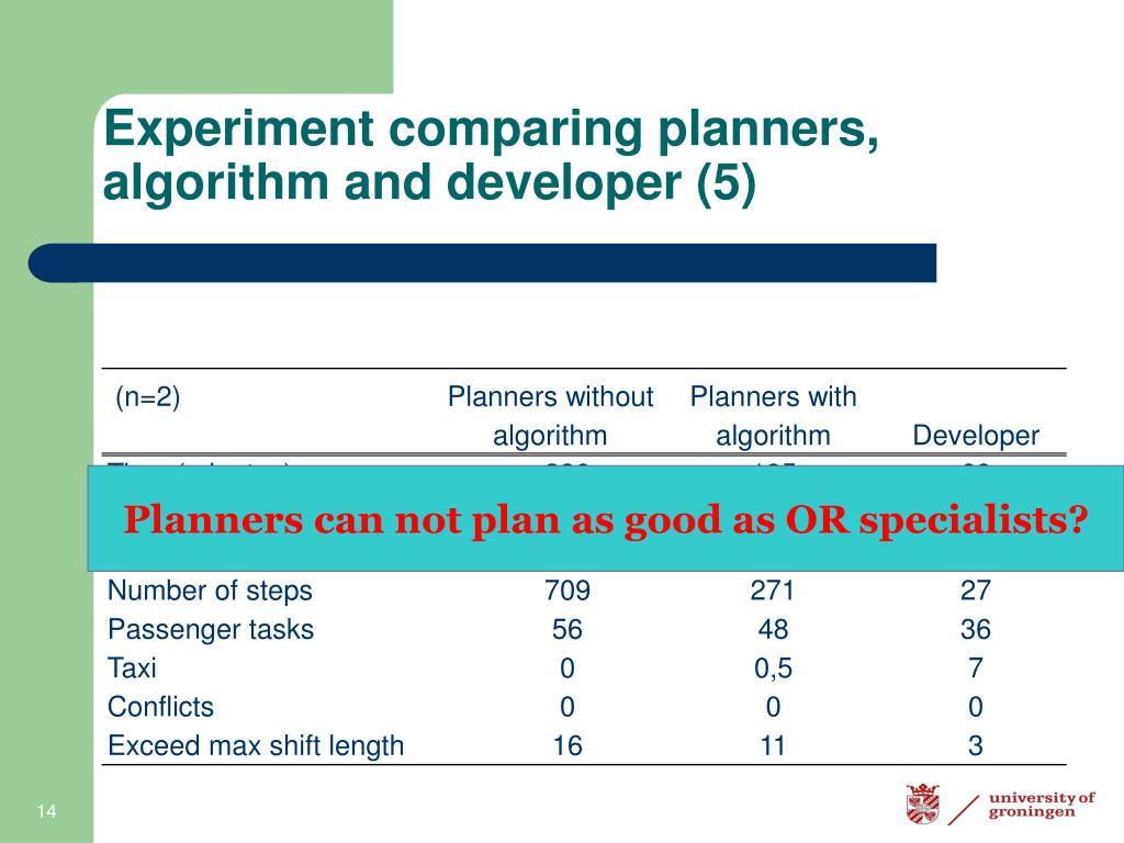 Experiment comparing planners, algorithm and developer (5) Planners can not plan as good as OR specialists?