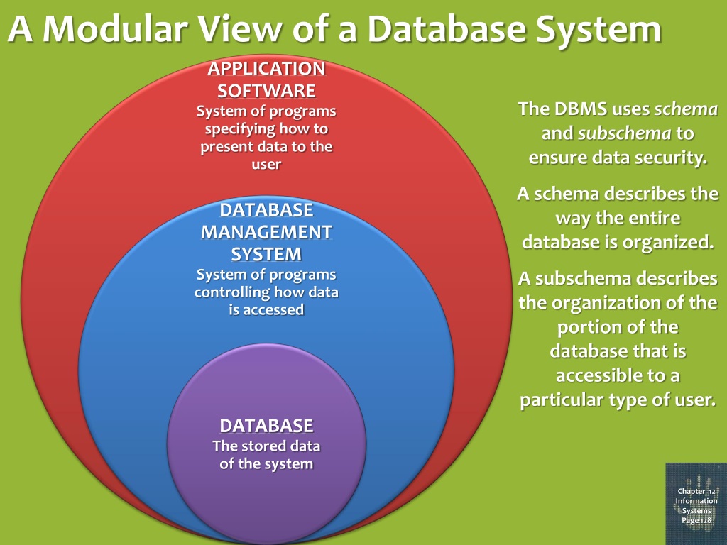 A Modular View of a Database System The DBMS uses schema and subschema to ensure data security. A schema describes the way the entire database is organized. A subschema describes the organization of the portion of the database that is accessible to a particular type of user. Chapter 12 Information Systems Page 128