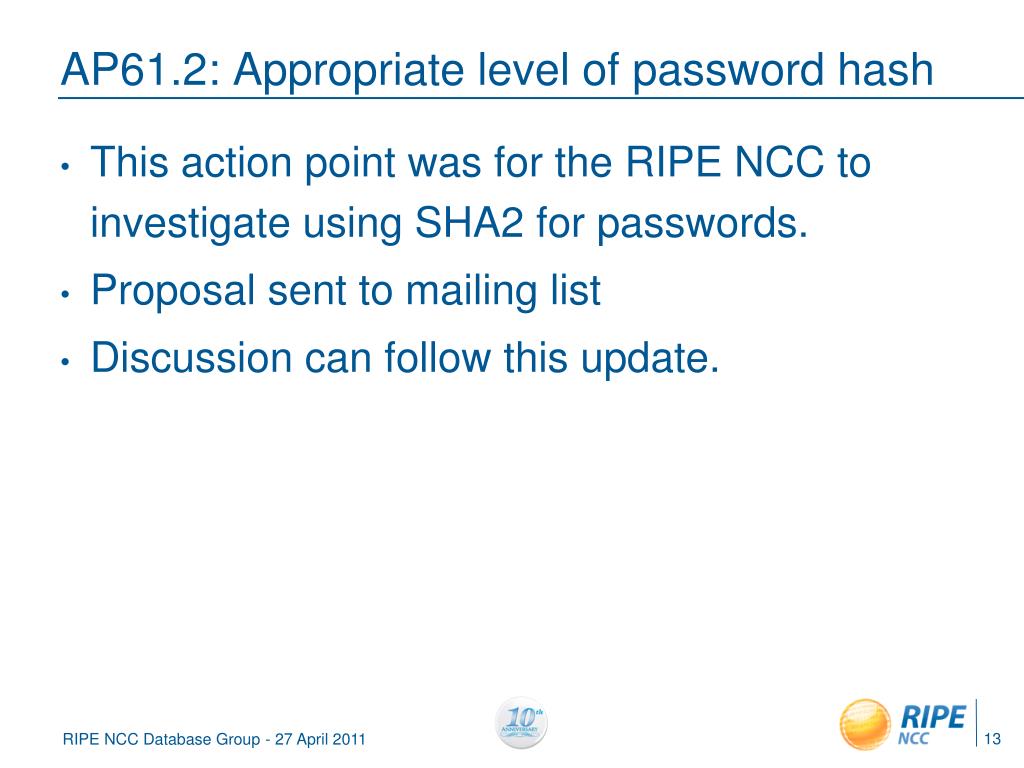 AP61.2: Appropriate level of password hash • This action point was for the RIPE NCC to investigate using SHA2 for passwords. • Proposal sent to mailing list • Discussion can follow this update.