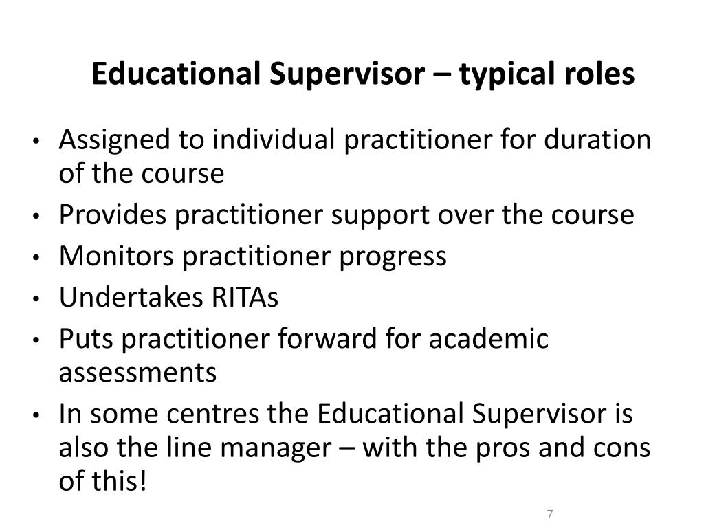 Educational Supervisor – typical roles • Assigned to individual practitioner for duration of the course • Provides practitioner support over the course • Monitors practitioner progress • Undertakes RITAs • Puts practitioner forward for academic assessments • In some centres the Educational Supervisor is also the line manager – with the pros and cons of this!