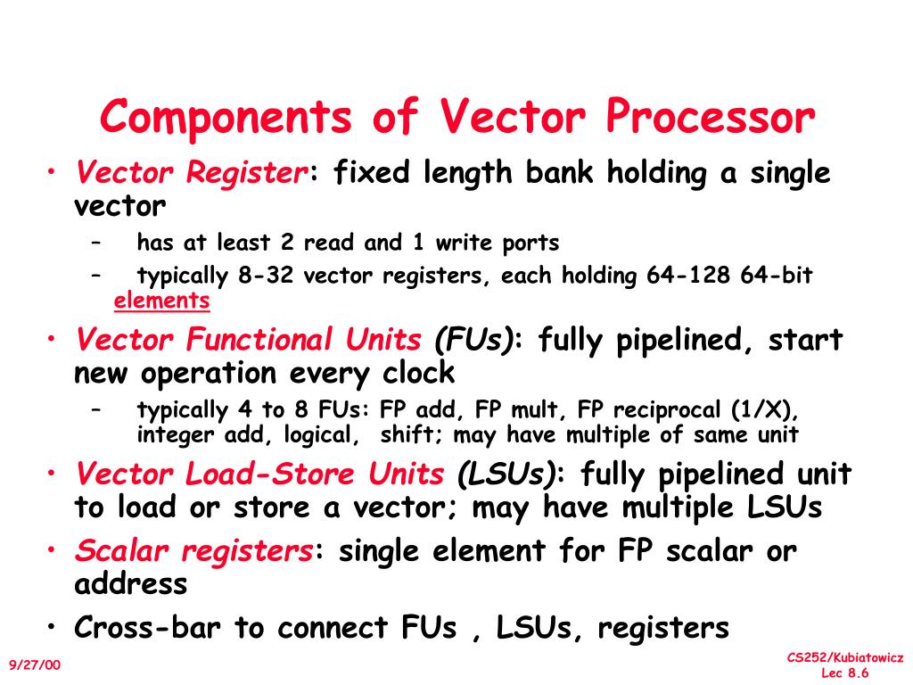 Components of Vector Processor • Vector Register: fixed length bank holding a single vector • has at least 2 read and 1 write ports • typically 8-32 vector registers, each holding 64-128 64-bit elements • Vector Functional Units (FUs): fully pipelined, start new operation every clock • typically 4 to 8 FUs: FP add, FP mult, FP reciprocal (1/X), integer add, logical, shift; may have multiple of same unit • Vector Load-Store Units (LSUs): fully pipelined unit to load or store a vector; may have multiple LSUs • Scalar registers: single element for FP scalar or address • Cross-bar to connect FUs , LSUs, registers