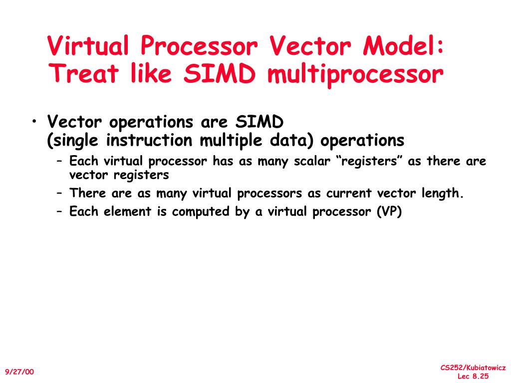Virtual Processor Vector Model:Treat like SIMD multiprocessor • Vector operations are SIMD (single instruction multiple data) operations • Each virtual processor has as many scalar “registers” as there are vector registers • There are as many virtual processors as current vector length. • Each element is computed by a virtual processor (VP)