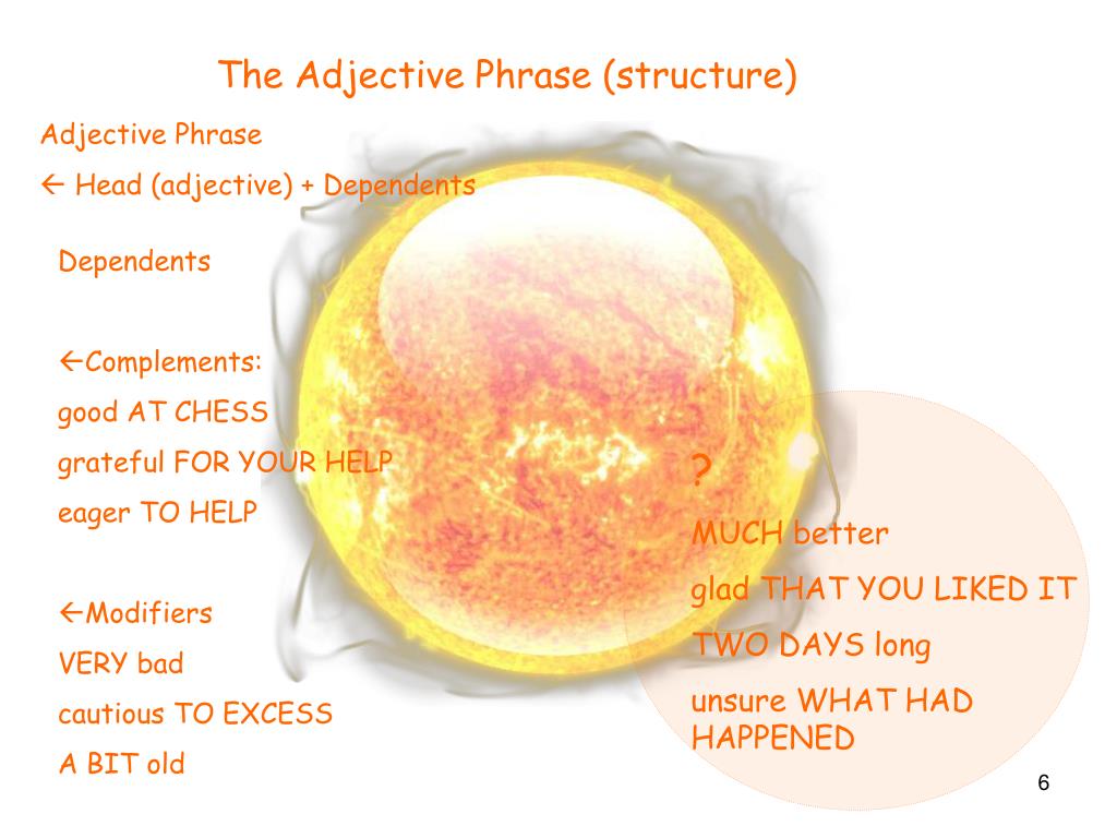 The Adjective Phrase (structure) Adjective Phrase Head (adjective) + Dependents • Dependents • Complements: good AT CHESS grateful FOR YOUR HELP eager TO HELP • Modifiers VERY bad cautious TO EXCESS A BIT old ? MUCH better glad THAT YOU LIKED IT TWO DAYS long unsure WHAT HAD HAPPENED