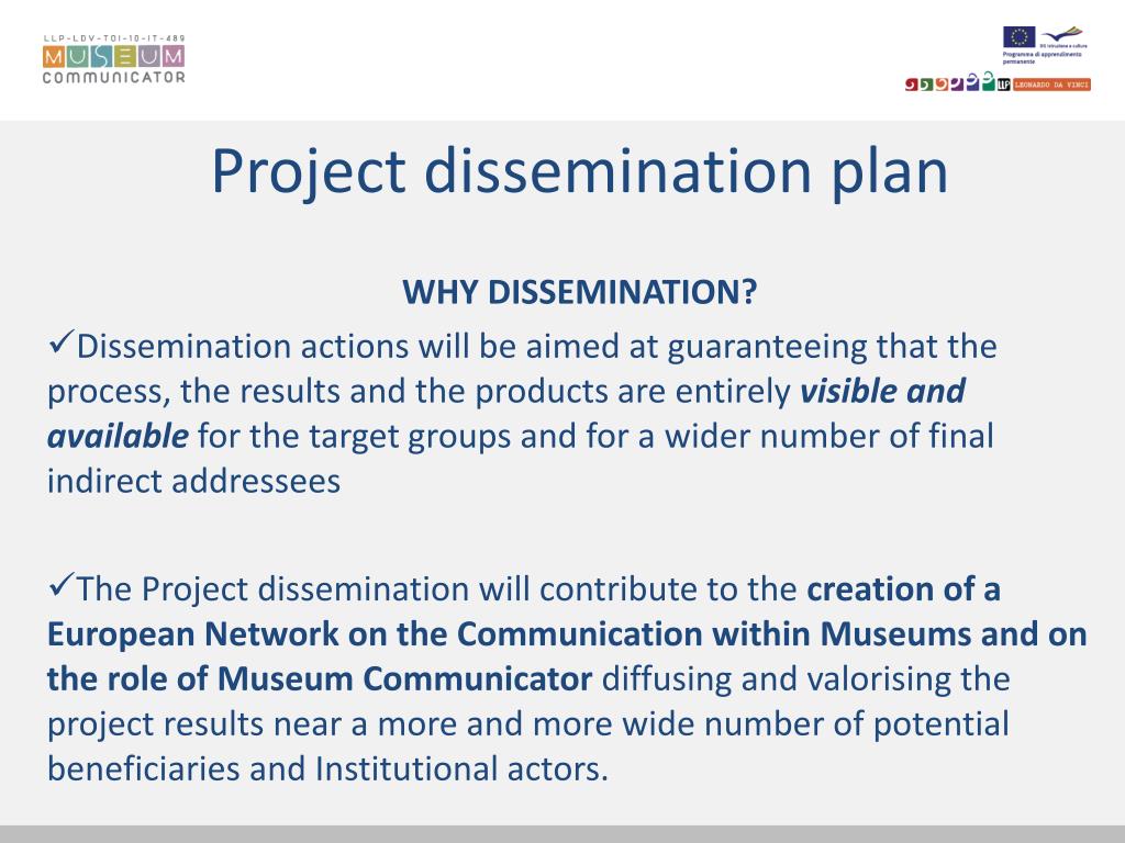 Project dissemination plan WHY DISSEMINATION? Dissemination actions will be aimed at guaranteeing that the process, the results and the products are entirely visible and available for the target groups and for a wider number of final indirect addressees The Project dissemination will contribute to the creation of a European Network on the Communication within Museums and on the role of Museum Communicator diffusing and valorising the project results near a more and more wide number of potential beneficiaries and Institutional actors.