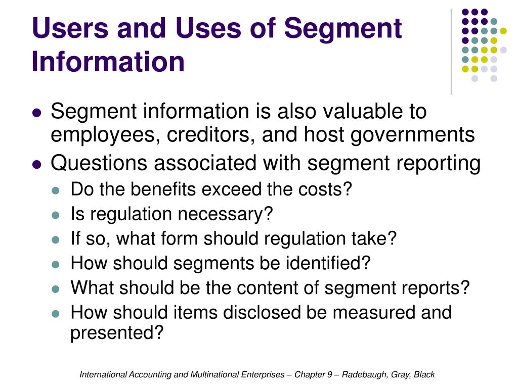Chapter 9. International Segment Reporting. Users and Uses of Segment Information. Diversification of operations leads to the need for segment information Segment data is typically provided for geographical areas and lines of business Segment information allows the following