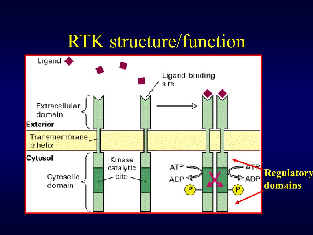 RTK family classification & structure/function • Four common structural features shared among RTKs: • Extracellular ligand-binding domain • Single transmembrane domain • Cytoplasmic tyrosine kinase domain(s) • Regulatory domains