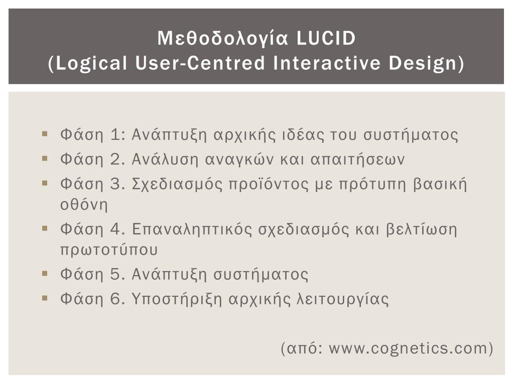 Μεθοδολογία LUCID (Logical User-Centred Interactive Design) • Φάση 1: Ανάπτυξη αρχικής ιδέας του συστήματος • Φάση 2. Ανάλυση αναγκών και απαιτήσεων • Φάση 3. Σχεδιασμός προϊόντος με πρότυπη βασική οθόνη • Φάση 4. Επαναληπτικός σχεδιασμός και βελτίωση πρωτοτύπου • Φάση 5. Ανάπτυξη συστήματος • Φάση 6. Υποστήριξη αρχικής λειτουργίας (από: www.cognetics.com)