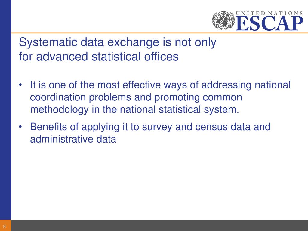 Systematic data exchange is not only for advanced statistical offices • It is one of the most effective ways of addressing national coordination problems and promoting common methodology in the national statistical system. • Benefits of applying it to survey and census data and administrative data
