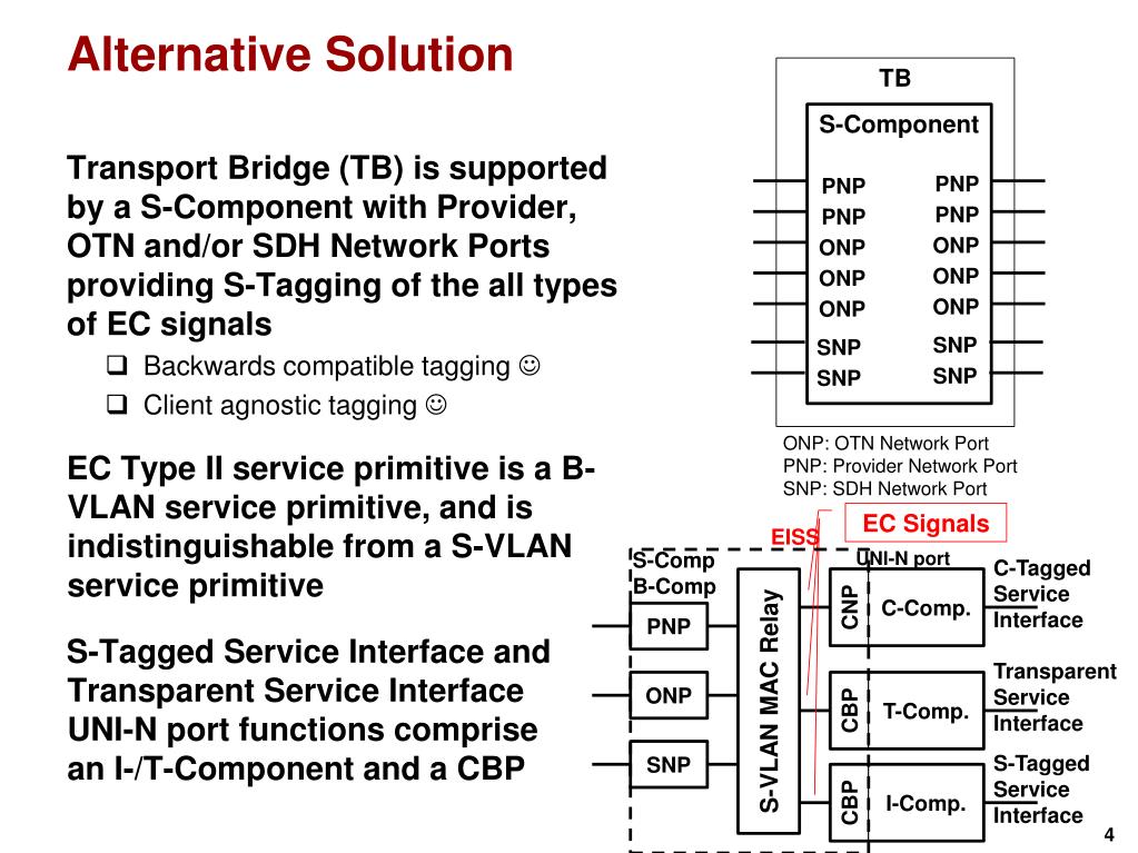 Alternative Solution TB S-Component PNP PNP PNP PNP • Transport Bridge (TB) is supported by a S-Component with Provider, OTN and/or SDH Network Ports providing S-Tagging of the all types of EC signals • Backwards compatible tagging • Client agnostic tagging • EC Type II service primitive is a B-VLAN service primitive, and is indistinguishable from a S-VLAN service primitive • S-Tagged Service Interface and Transparent Service Interface UNI-N port functions comprisean I-/T-Component and a CBP ONP ONP ONP ONP ONP ONP SNP SNP SNP SNP ONP: OTN Network Port PNP: Provider Network Port SNP: SDH Network Port EC Signals EISS S-Comp B-Comp UNI-N port C-Tagged Service Interface CNP C-Comp. S-VLAN MAC Relay PNP Transparent Service Interface ONP CBP T-Comp. SNP S-Tagged Service Interface CBP I-Comp.